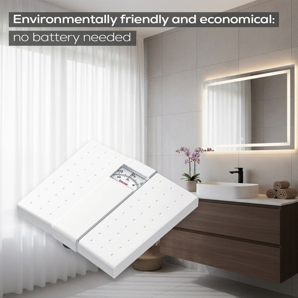 Product name: Beurer MS 01 Mechanical Bathroom Scale. Body Weight Scale. Beurer Mechanical Scale. Analogue Bathroom Scale. Eco-friendly Bathroom Scale. No Battery Scale. Bathroom Weight Scale. German Engineering Bathroom Scale. White Mechanical Scale. Large Display Bathroom Scale. Home Health Scale. Beurer Weight Scale. 120kg Capacity Scale