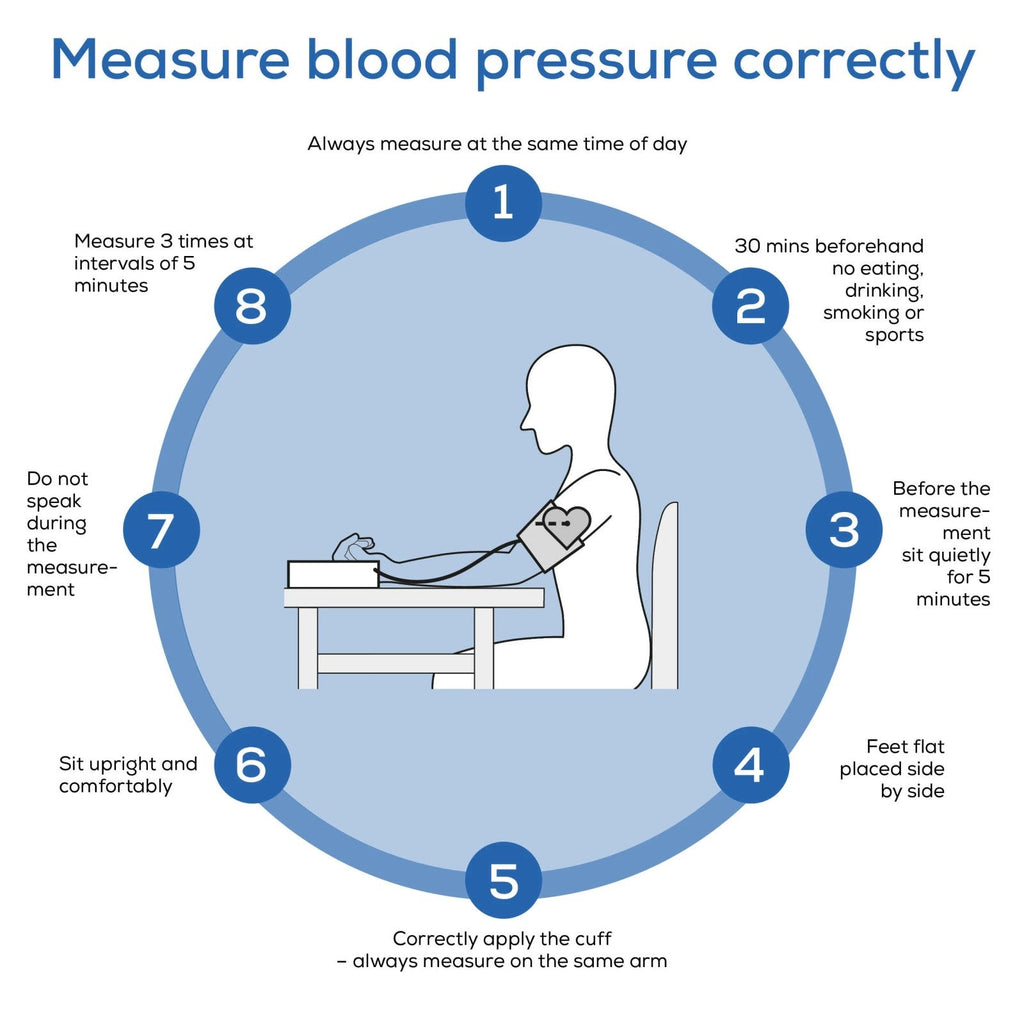 Rest for 5 minutes before measuring; wait 30 minutes after eating, smoking, drinking, or exercising.