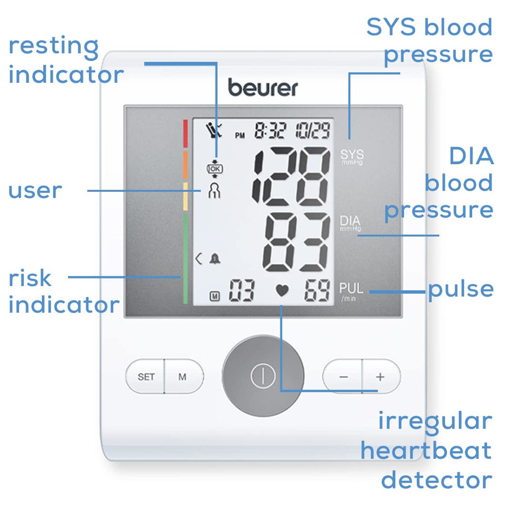 > Product: Beurer BM 28 digital automatic upper arm blood pressure monitor. Accurate blood pressure monitor with arrhythmia detection, rest indicator, cuff fit control, alarm reminder, WHO risk indicator, averaging function, memory for multiple users. Easy-to-use BP monitor with LCD display. Blood pressure monitor with large cuff. Clinically validated BP monitor. BP monitor with HSD diagnostics. Medical device for tracking hypertension. Blood pressure monitor suitable for pregnant women.