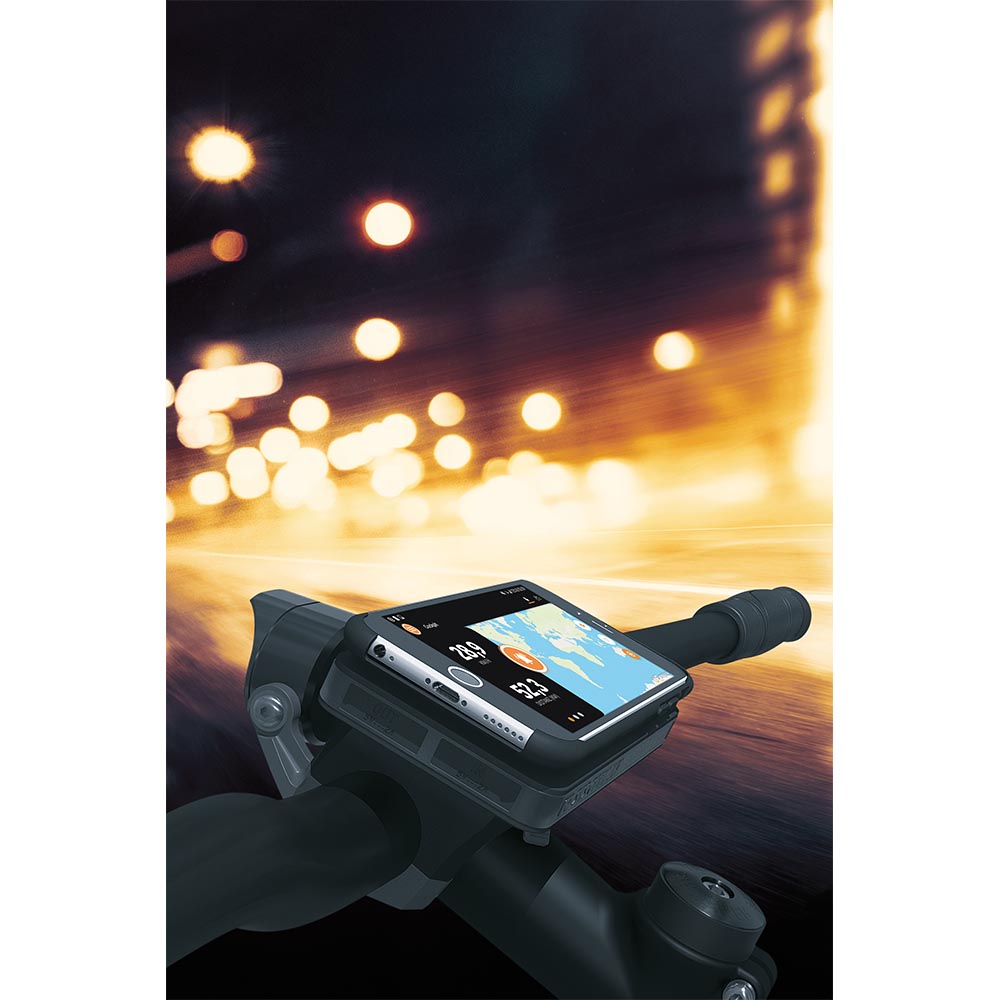 The +COM/UNIT is used to charge and connect the smartphone while cycling. It can be affixed to the