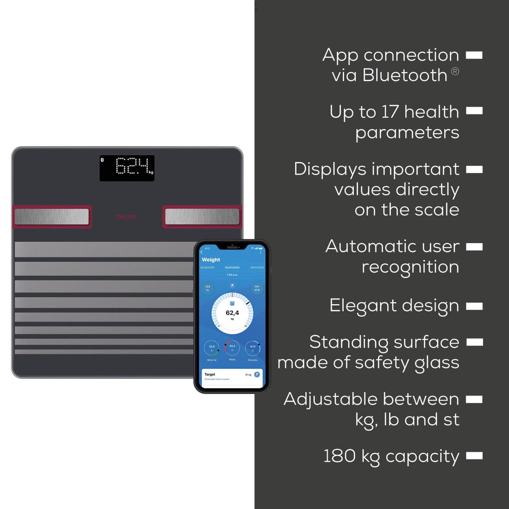 > Further values available with the free "beurer HealthManager Pro" app: Soft lean mass, lean body mass, subcutaneous fat, body profile, ideal weight, bone mineral weight, protein and total muscle mass (including organ muscles)