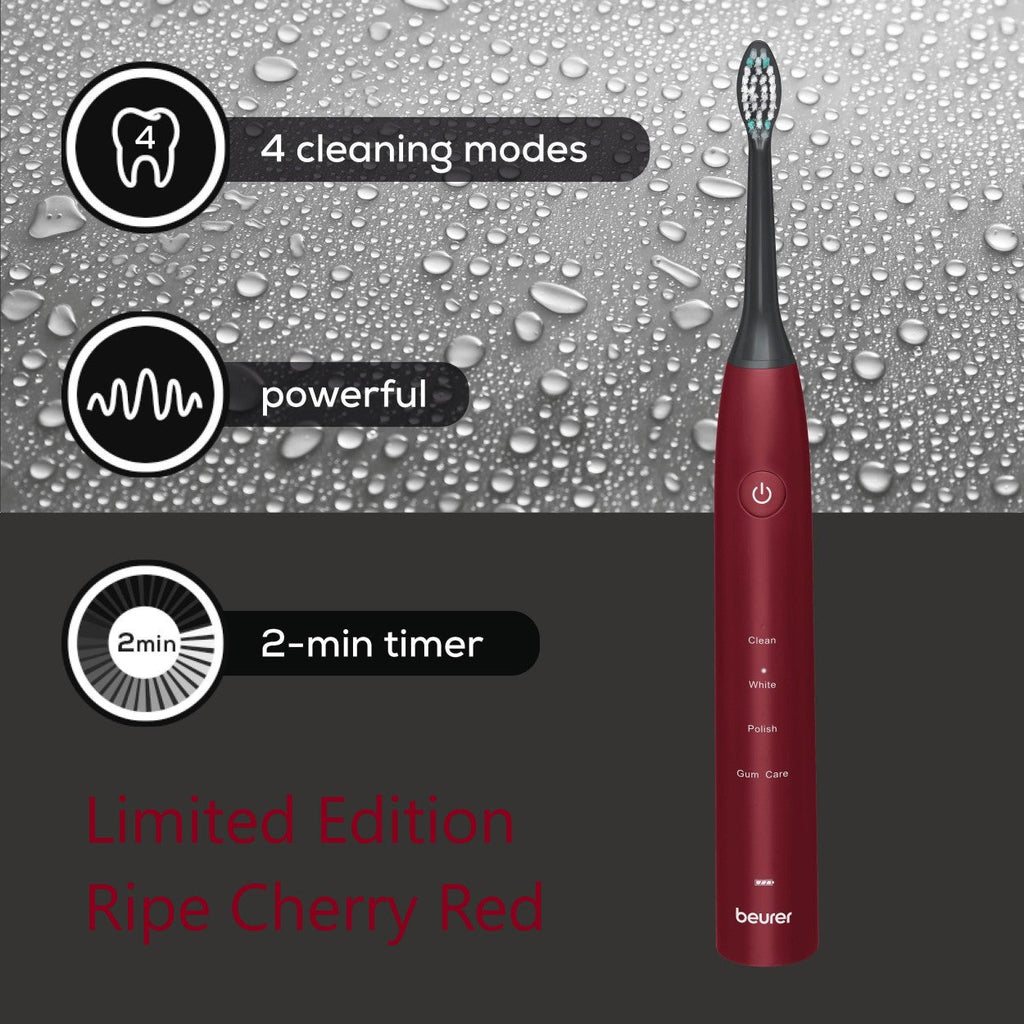 - Product designation: SC 30 LE25 Electric Toothbrush. Beurer sonic toothbrush. Eco-friendly electric toothbrush. Rechargeable electric toothbrush with timer. Sustainable electric toothbrush. Toothbrush made from recycled materials. Electric toothbrush with timer. Long battery life toothbrush. Electric toothbrush for whitening and gum care. Toothbrush with 4 brushing modes and LCD display. Toothbrush for plaque removal and whitening. Electric toothbrush for travel with USB charger. Limited Edition Ripe Cherry Red