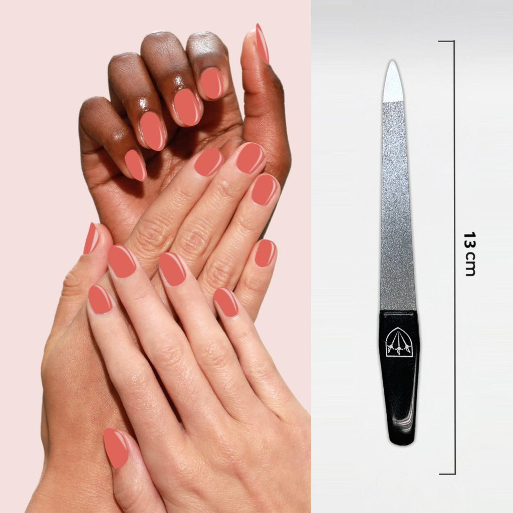 Crafted from hardened stainless spring steel, featuring a sapphire-coated surface with sharp-edged abrasive particles for precise, gentle filing.