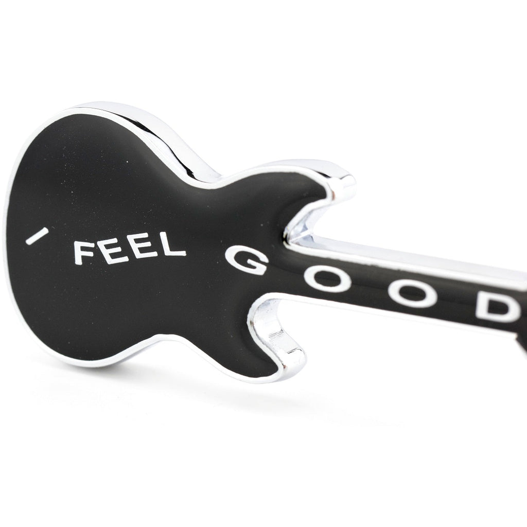 - Keyring with writing "I feel good", guitar, cast metal, enamel, chrome plated, shiny, black/silver coloured.