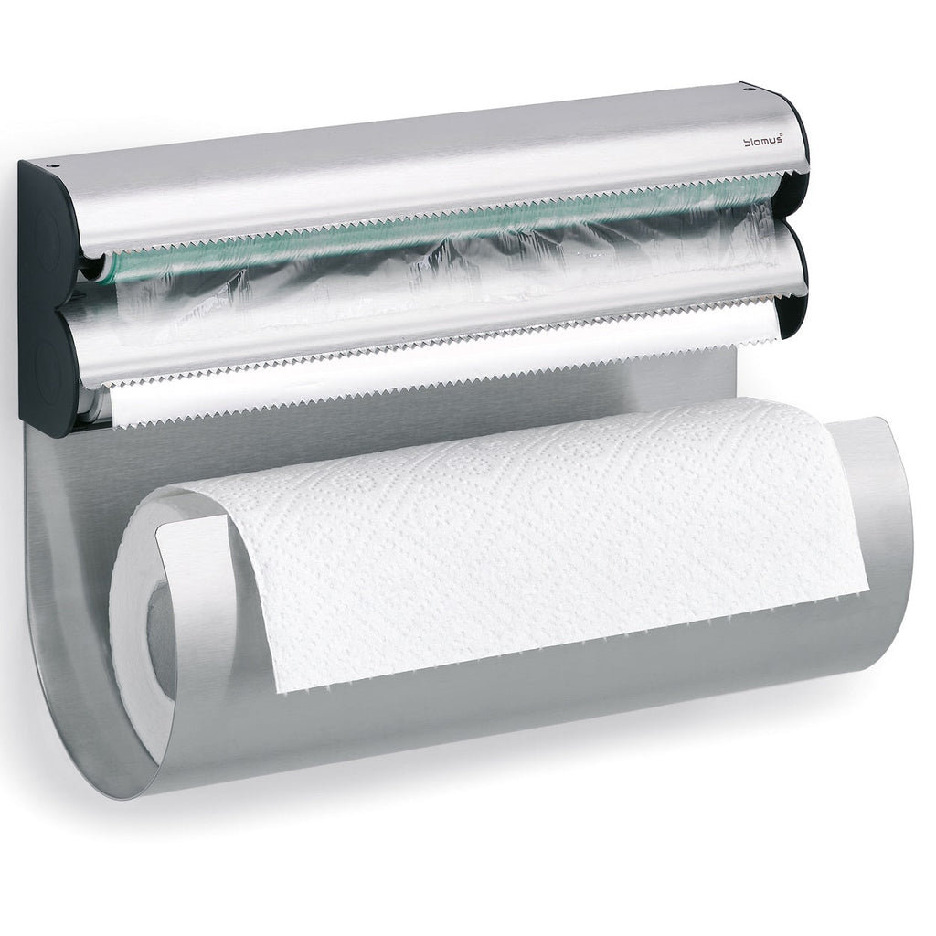 Neatly organizes paper towels, foil, and plastic wrap in one unit.