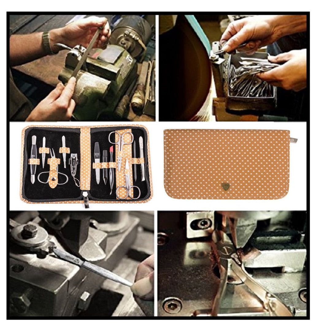 All The steel implements in the manicure set are first-class steel quality tools, which have been handmade in Germany (other than clippers).