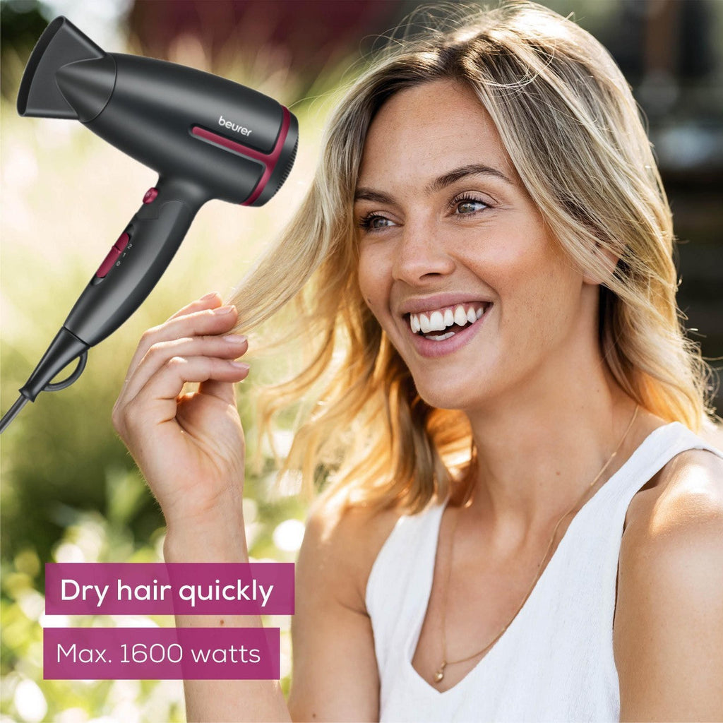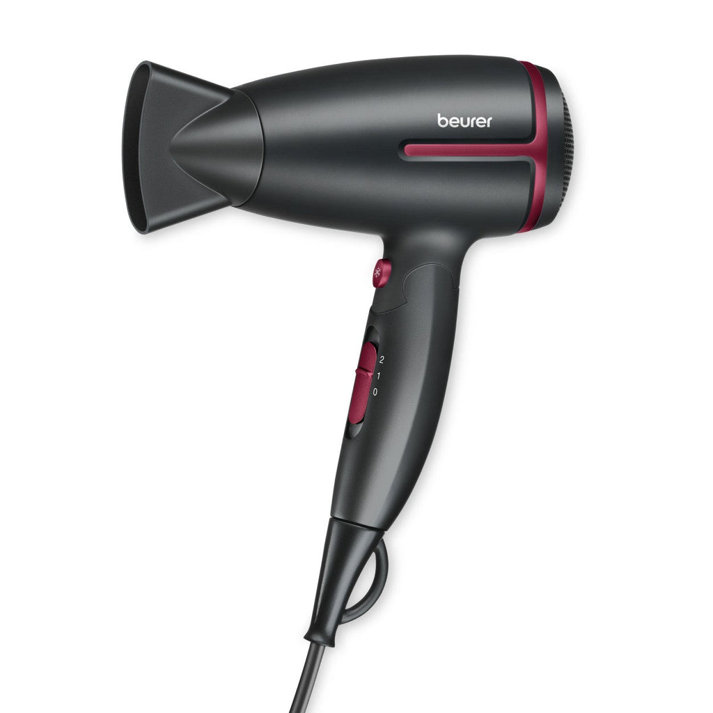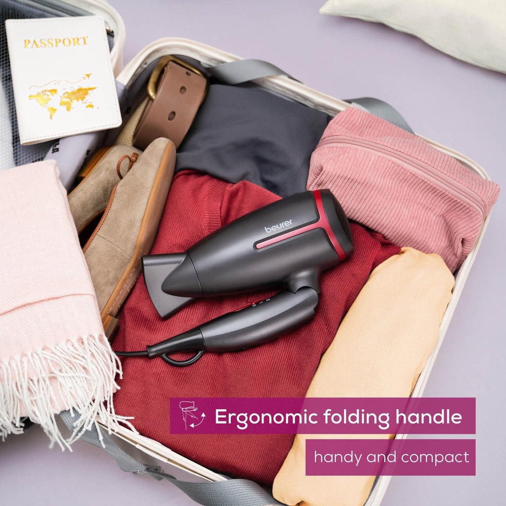 Product: Beurer HC 25 LE25 Travel Hair Dryer. Compact hair dryer, foldable travel dryer, dual-voltage hair dryer, worldwide voltage hairdryer, 426g travel hairdryer, ionic travel dryer, Beurer Germany hair dryer, portable hair dryer, 1600W travel dryer